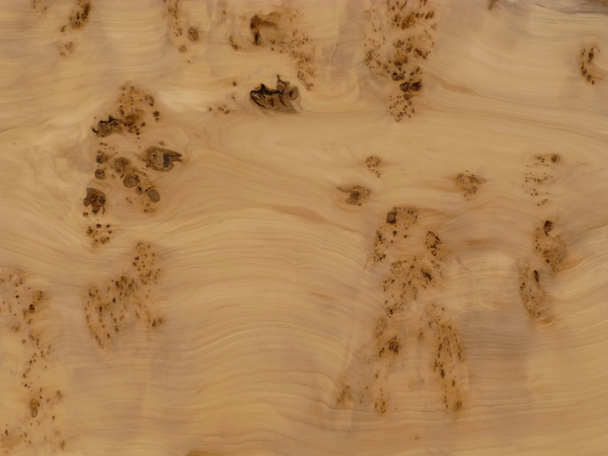 A light, white and bright wood with a subtle grain that looks particularly distinctive when in combination with contrasting dark spotty burrs.